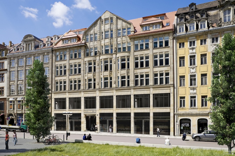 Die Katharinenstraße 17 entstand zwischen 1910 und 1912 als modernes sechsgeschossiges Handelshaus in richtungweisender Stahlbetonskelettbauweise. Unter Rückgriff auf lokale Traditionen plante Architekt Max Fricke die Räumlichkeiten um einen großzügigen weiß gefliesten Innenhof mit Durchgang zur Hainstraße 14. Das Gebäude verfügt über große Fensterflächen und besticht durch seine opulente Schaufensterfront sowie den prägnanten Giebel. Vier weitere kleine Innenhöfe sorgen für eine zusätzliche Belichtung der rückwärtig gelegenen Gewerbeflächen.